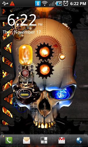 Steampunk Skull Free Wallpaper apk | Live Wallpaper featuring a Steampunk skull with rotating gears, animated bulbs, lights, scrolling designs and interactive touch effects. The gears spin and track your finger movements. For fans of steampunk, science fiction, horror, technology, the victorian era, clockwork, and our other skull wallpapers.
